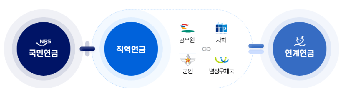 마지막으로 연계연금 이 있으며, 이는 국민연금과 직역연금을 연계하여 수급할 수 있는 연금입니다.이들 각각의 연금은 서로 연결되어 있습니다.