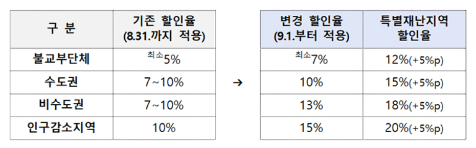 기존 통상 5~10% 수준에서 지자체 유형별로 7%~15%까지 기본 할인율을 인상합니다.